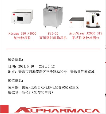 第60届(2021年春季)全国制药机械博览会暨2021(春季)中国国际制药机械博览会将于2021年5月10日至12日在青岛世界博览城举办。上海奥法美嘉生物科技有限公司携PSS Nicomp N3000 纳米粒度仪、PSI-20高压微射流均质机、PSS AccuSizer780 SIS 不溶性微粒分析仪亮相。